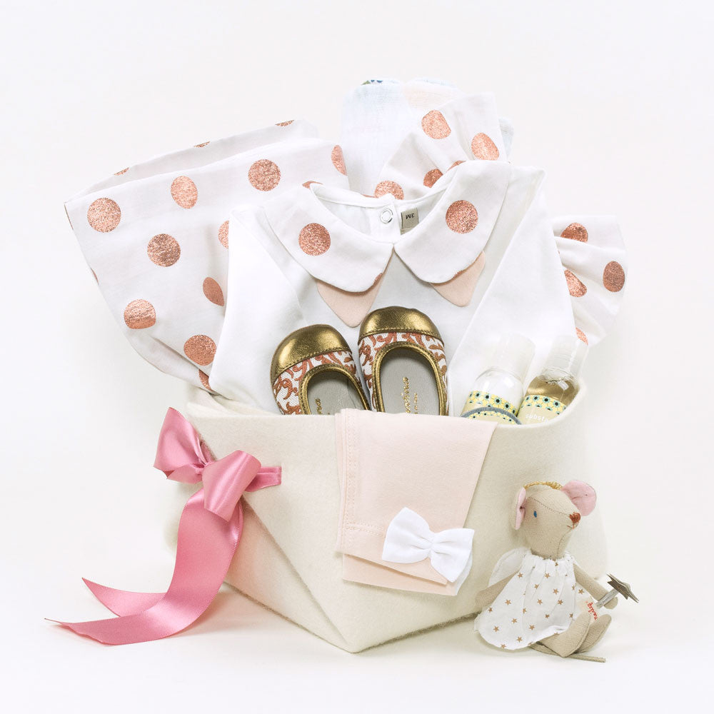 Pink Gold Polka Dots ! Adorable Hucklebones onesie with lovely polka dots collar perfectly curated with a skirt tutu made with a luxurious fabric, fully lined and featuring an exposed contrast tulle underskirt, a headband bow and a pair of leggings complements this unique combo The softest nappa leather sandals are the perfect addition to this luxury baby girl gift basket. We’ve added an extra large muslin blanket, a sweet mouse by Maileg and the best skin care baby products by Matter Company. These beautifully curated items are delivered in our signature wool felt storage basket, perfect for any nursery.