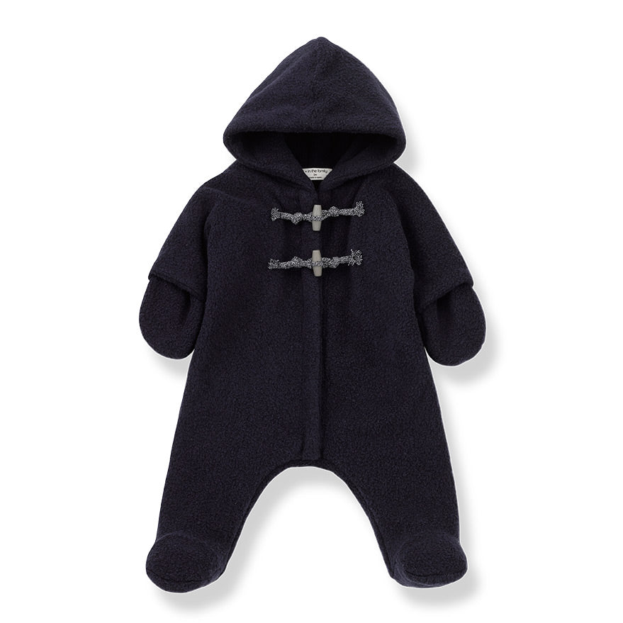 Keep those chubby feet warm with this footed jumpsuit with mitts by 1+in the Family. Perfect for the cooler temperatures. Close with hidden snaps at the front. Made with cotton soft polar fleece in Spain. Size 6 and 9 months