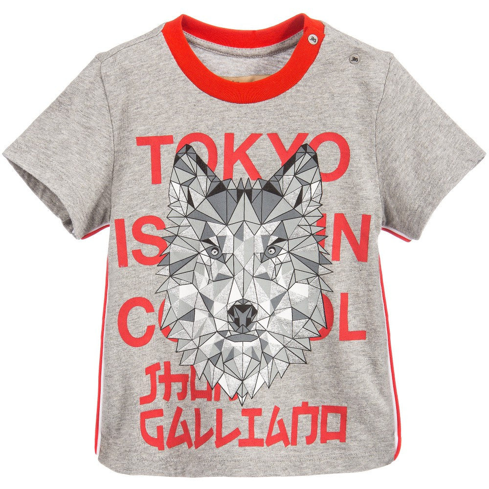 Trendy baby boy  t-shirt by John Galliano, made from soft cotton. It has branded snaps  on one shoulder and stunning a fabulous grey and silver wolf design.