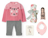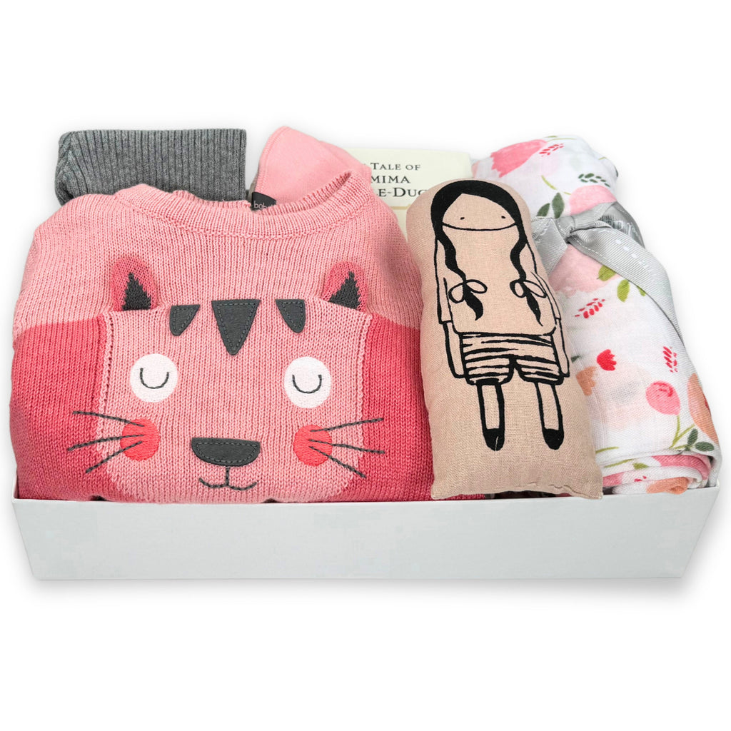 Perfect welcome gift for a little girl! This adorable set includes a knitted sweater with a cute kitty cat applique, cotton ribbed leggings, a soft swaddle blanket in a beautiful pattern, a coordinated color bib, a classic book by Beatrix Potter and rattle doll for little hands. The perfect gift for any new baby girl, this set is both stylish and functional. Presented in one of our luxury gift boxes.