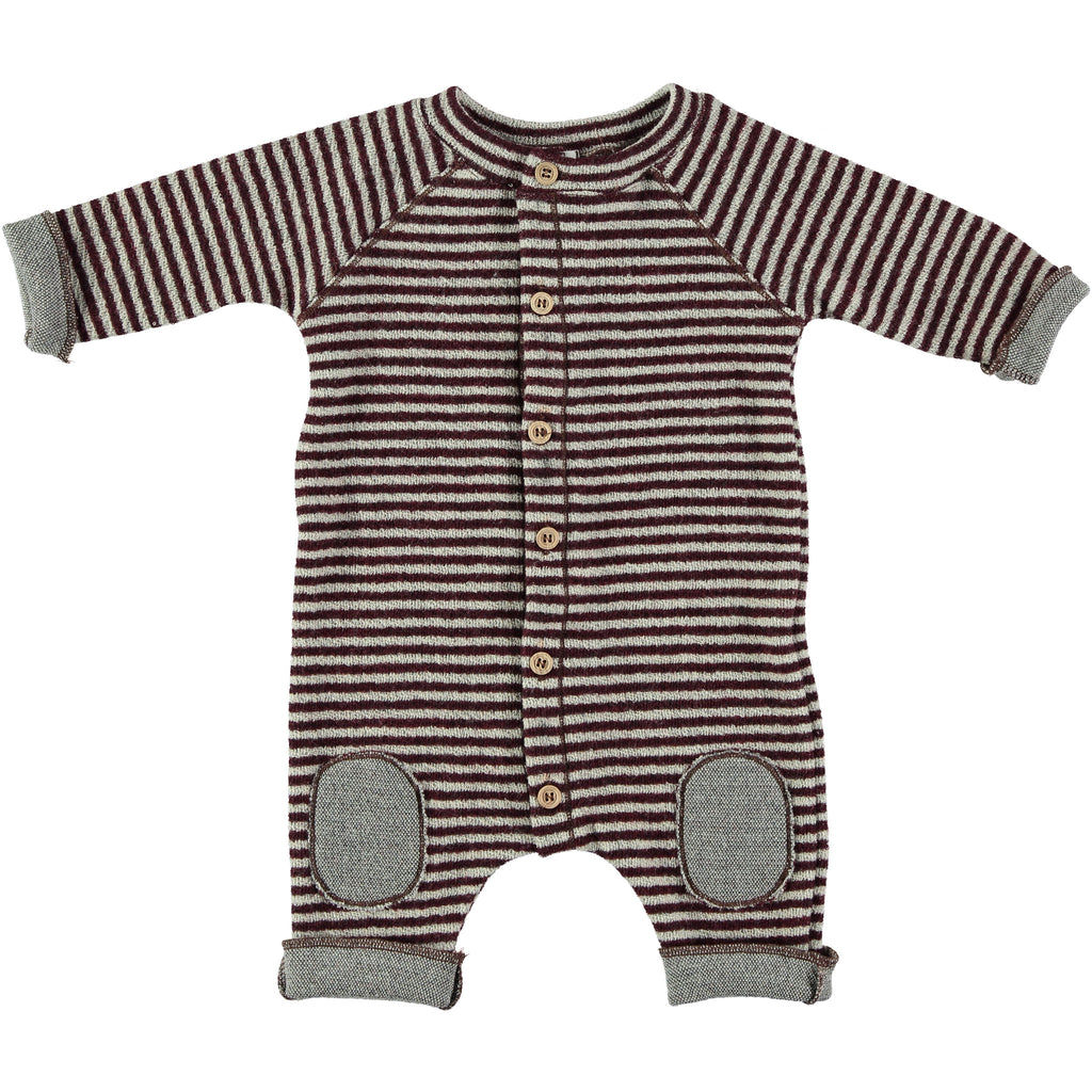 This adorable comfy jumpsuit in bordeaux stripes in a cotton/wool blend with adorable wooden buttons and knee patches is just too cozy and will be your fave piece of the season.
