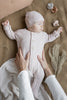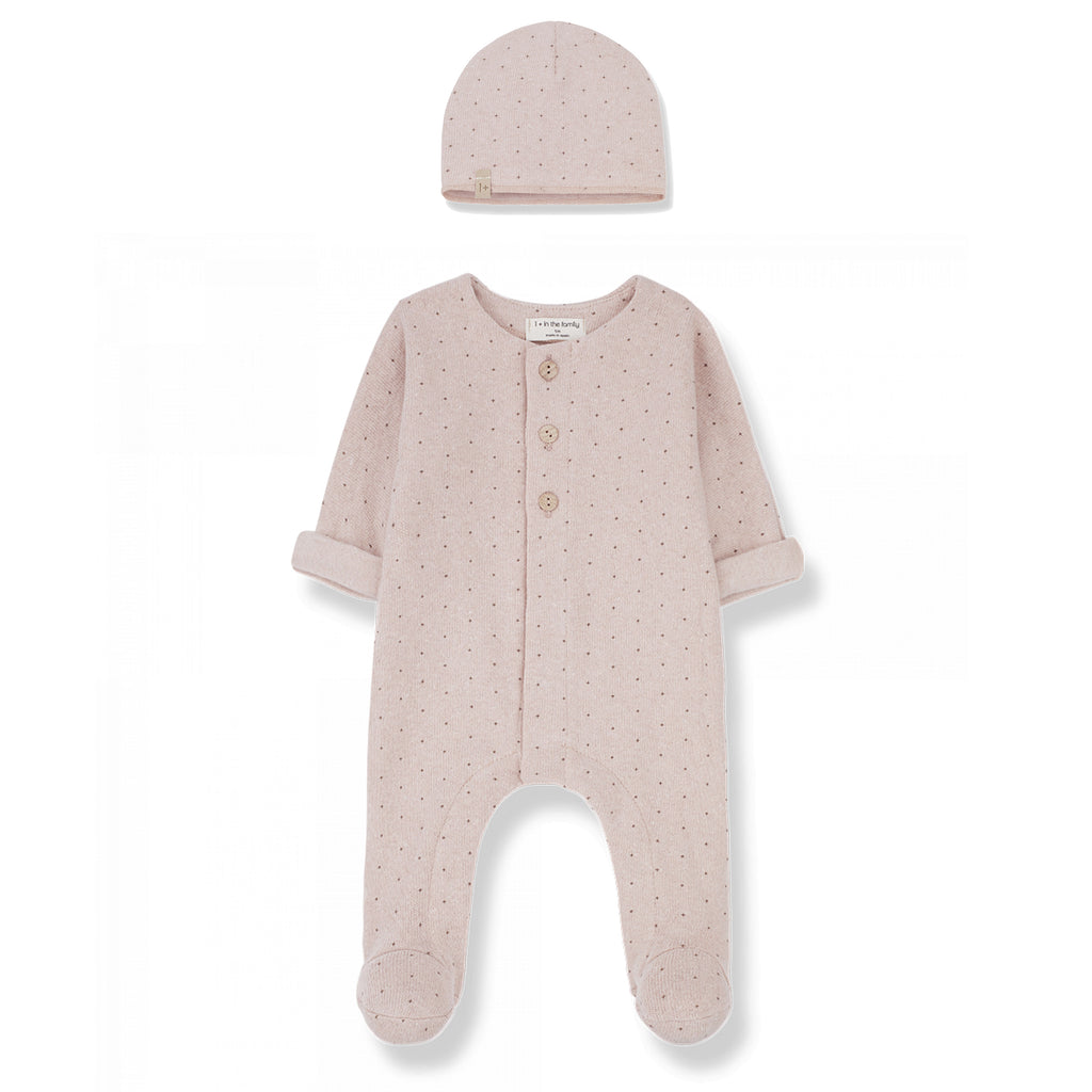Cozy and soft recycled cotton jersey sleeper by 1+ in the Family with a matching hat in a blush colour with little dots.Ā Snaps in the front and in between the legs for easy changing.Ā Perfect addition to your BYOB (Build Your Own Basket) or to gift on its own.