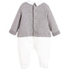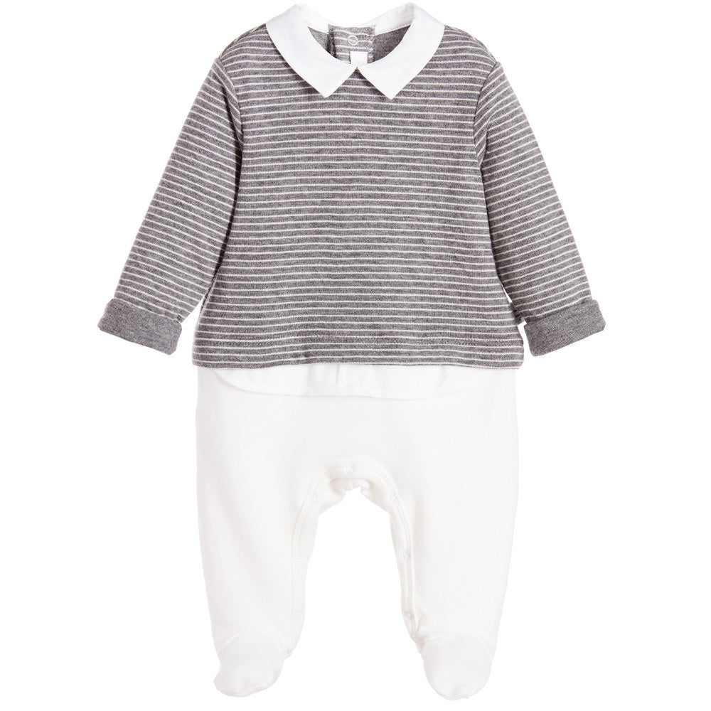 Luxurious footie by Il Gufo in soft cotton jersey with a light fleece interior and snaps at the bottom and back. Features a lovely ivory collar and grey stripes top in a clever design making it look like a set of shirt, sweater and trousers in a one-piece.
