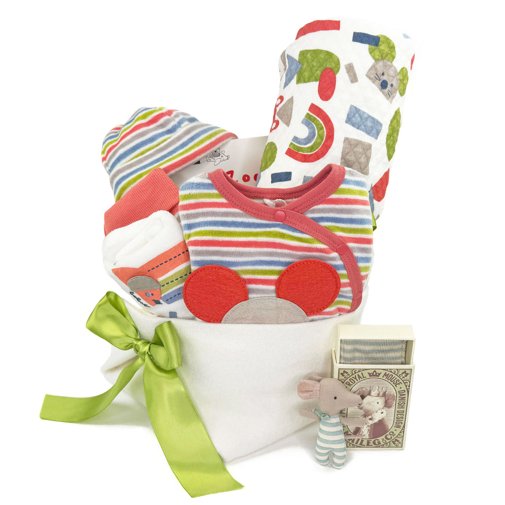Get ready to pamper the new arrival with our Be Cute Neutral Baby Gift Basket! Featuring a velour kimono sleeper, top and pants set, cozy beanie, and reversible stroller blanket in coordinated prints from Spanish designer, Boboli, along with an activity book by Wee Gallery and the cutest collectible baby mice by Maileg. All presented in a chic, reusable basket with a silky bow.