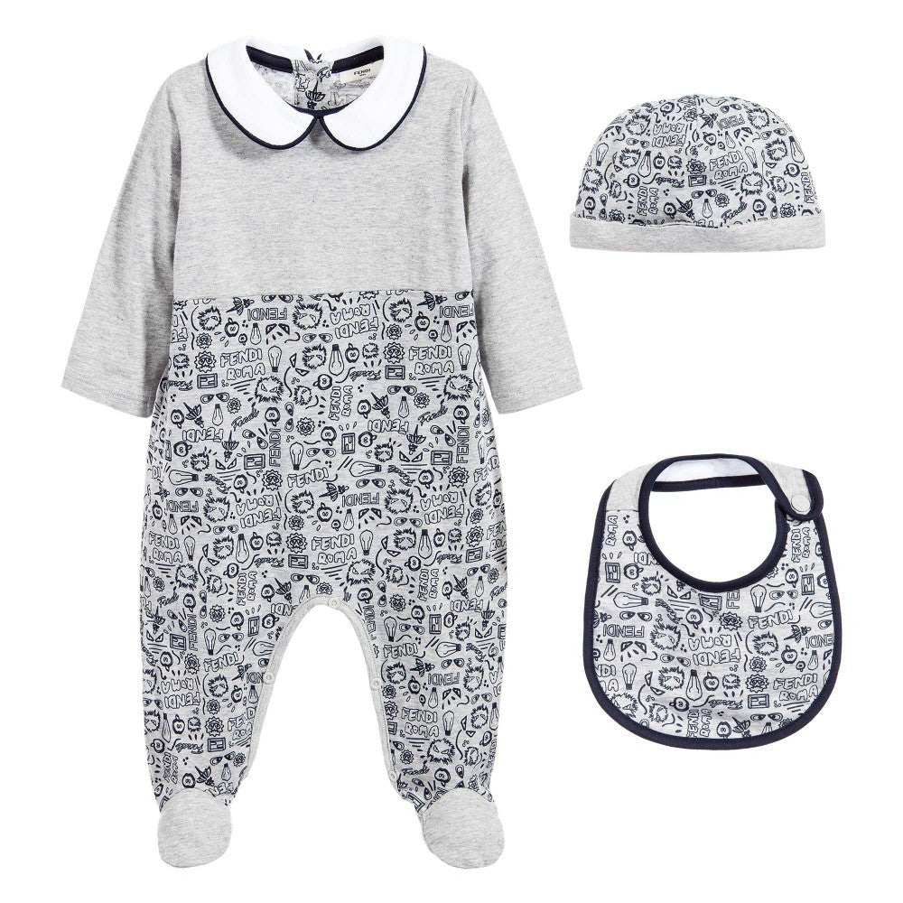 Gorgeous 3 piece unisex baby gift set by Fendi, made from a soft cotton jersey with their distinctive designer's signature monster eyes, lightbulbs and Roma logo. The footed sleeper has a cute piquĂ© collar and fastenings in the back and between the legs for easy changing. Matching hat and bib complements this beautiful set that comes in Fendi box. Made in ItalyÂ