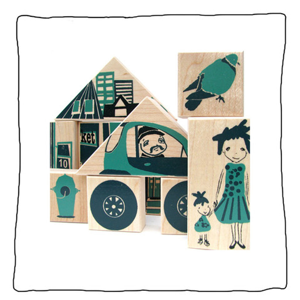 The City block wooden set is hand-printed with illustrations of life in the city. You can build, stack and display it any way you like! When the blocks are flipped over to the red side, they form a puzzle.