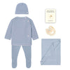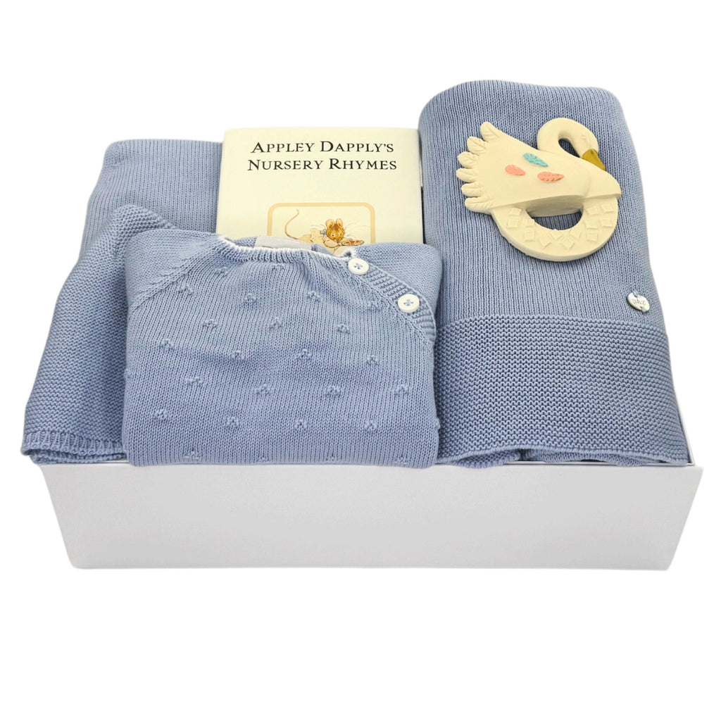Get ready for cuteness overload with the Paz Rodriguez Baby Gift Box in blue. This playful set includes a soft knitted long sleeve top and pants, an adorable stroller blanket, and a hat in soft knitted cotton. Plus, we've added a natural rubber swan by Moulin Roty and a lovely book by Beatrix Potter. Perfect for spoiling the newest little one in your life!Made in Spain