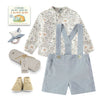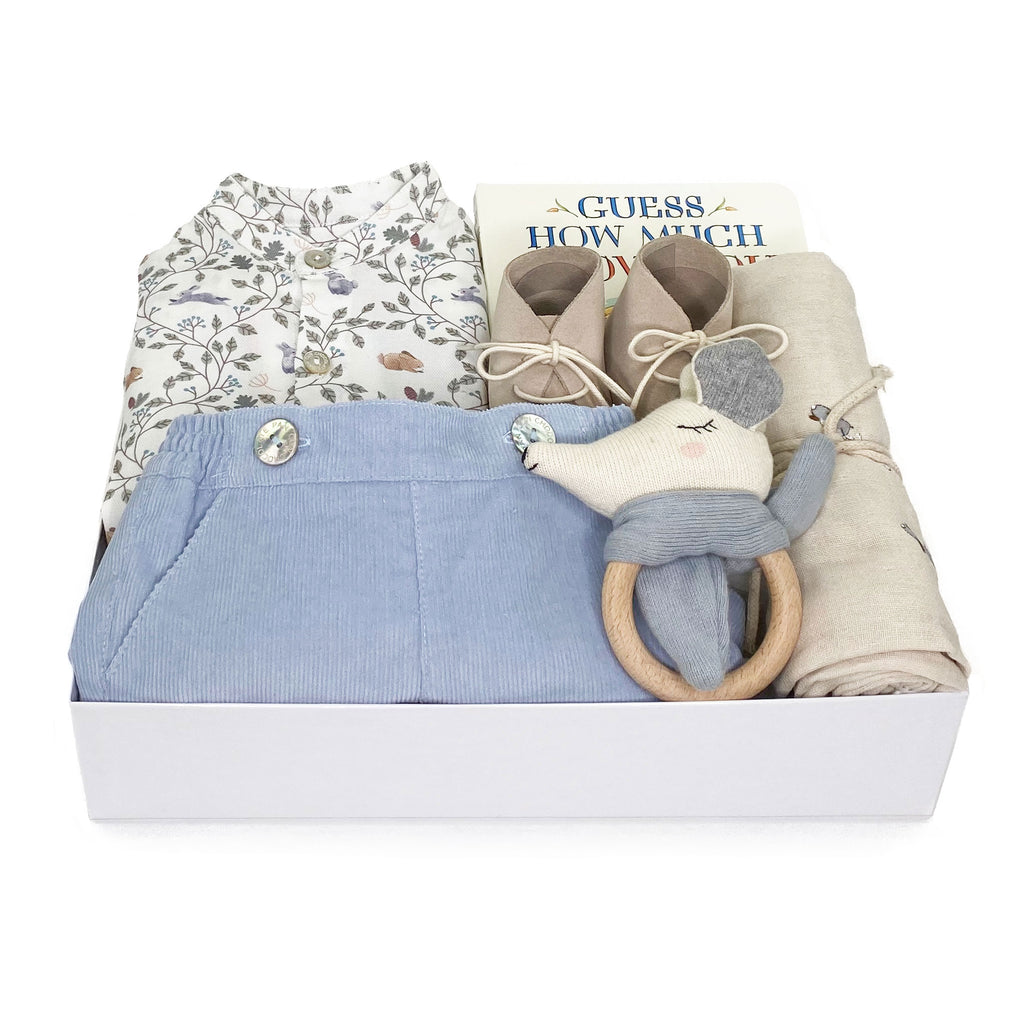 Luxury baby boy gift box featuring an adorable corduroy shorts with suspenders and a cotton shirt with bunnies print by Spain designer Pan con Chocolate. We have curated this sweet baby gift with a teether bunny, suede shoes made in France, a book for baby's first library and a blankie with airplanes print.
