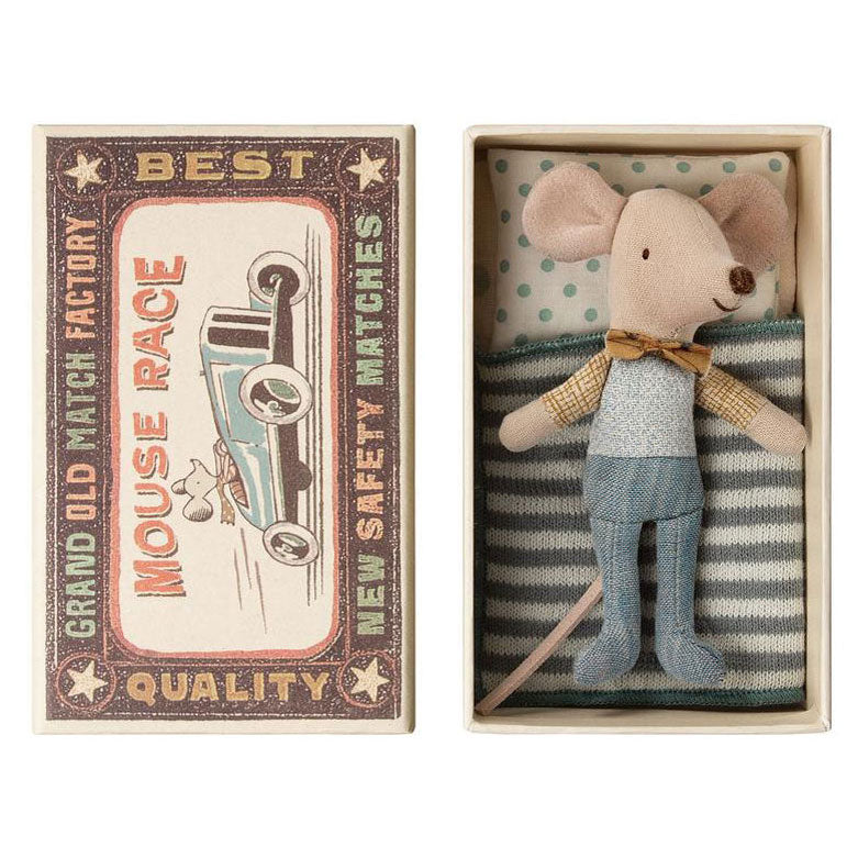 From Maileg's collection of Mouse in a Box, Little Brother is so cute with his cute bow tie. Comes with matchbox, pillow, blanket, and bedding.