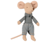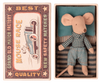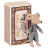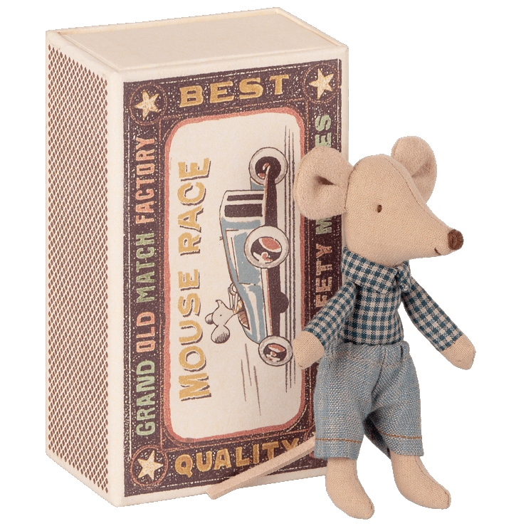 Adorable little brother from Maileg's collection of Mouse in a Box. Very fashionable dressed with a plaid shirt and jeans, arrives with its matchbox, pillow, blanket, and bedding.