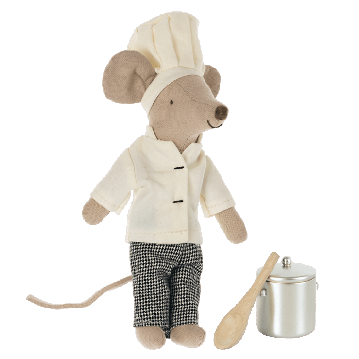 The cutest Maileg chef mouse playset including a soup pot and spoon. Great for hours of adorable playtime.