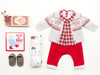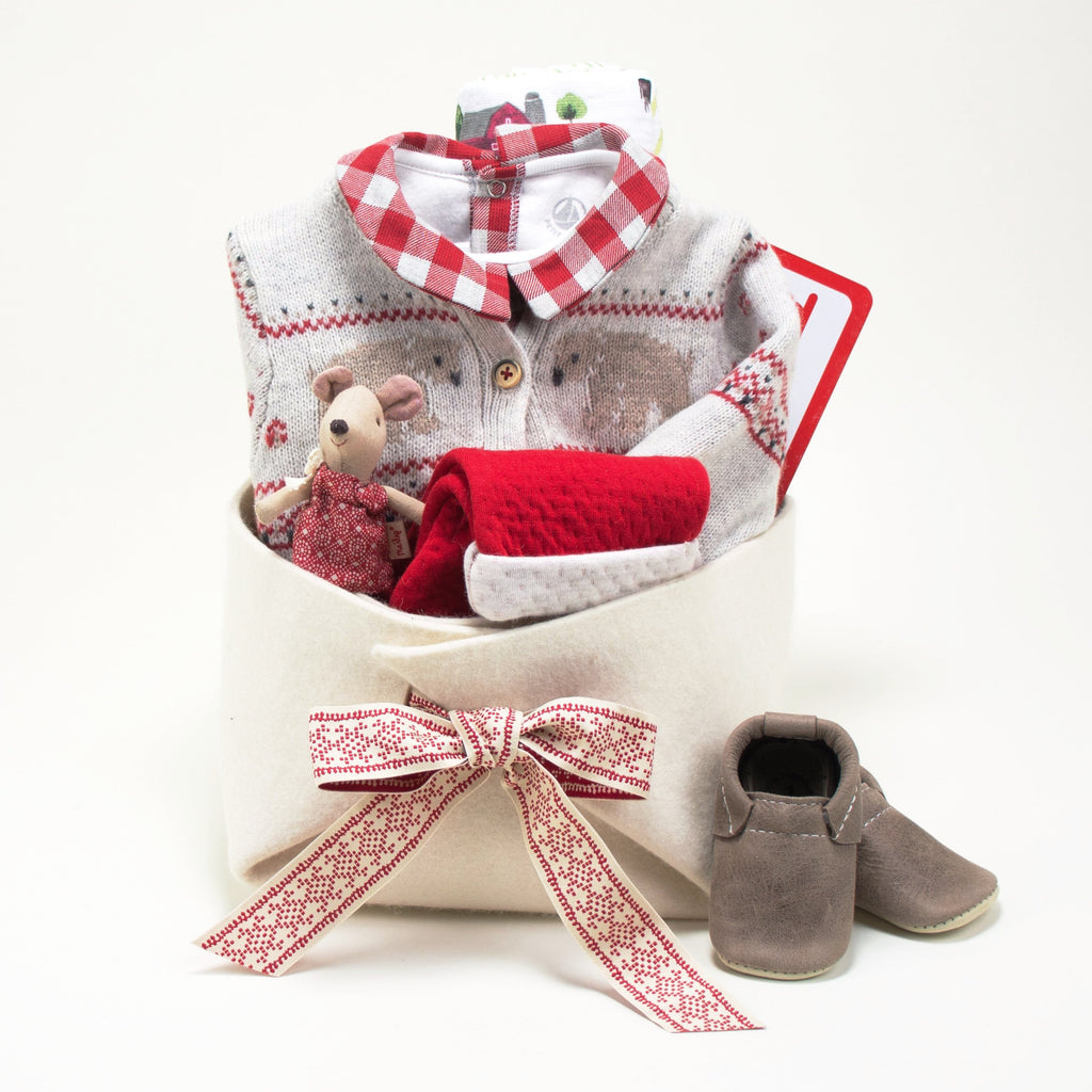 • Gorgeous Petit Bateau outfit for a sweet baby girl. This luxury gift basket features a onesie/blouse in adorable red and white plaid, comfy pants in soft cotton and a sweet knitted sweater perfect for layering during the change in weather. Our stylist carefully curated this perfect combo leather shoes in a distressed driftwood colour by Minimoc, a swaddle blanket by Little Unicorn, a little mouse sister in her matchbox and one of our fave books for baby's first library.  These trendy items are delivered in our signature wool blend felt storage basket, perfect for any nursery.