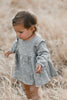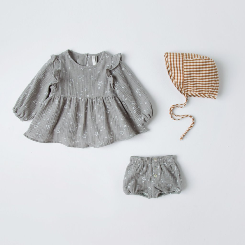 This trendy baby dress and bloomer set by Rylee and Cru is just too adorable! Perfect pairing with the gingham bonnet. Soft cotton with sweet stars all over from their collection "Prairieland"