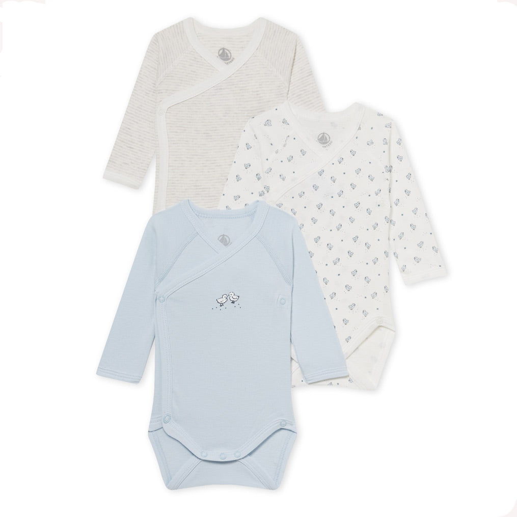 Adorable set of three baby girl kimono onesies by Petit Bateau in their gift box. Soft and cozy for your babes. Perfect for a babyshower gift. 100% cotton.