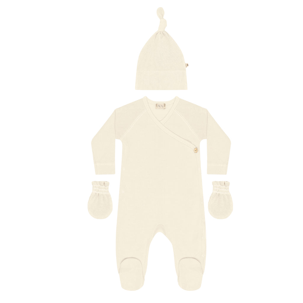 Pima cotton 3 piece Baby Gift Set featuring a lovely kimono romper, mitts and a a knotted beanie in a soft cream colour by UAUA. Great addition to your BYOB or to gift on its own.