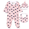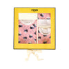 How unique is this gorgeous 3 piece baby gift set by Fendi, made from a soft cotton jersey with their distinctive designer's signature bag bugs print ! The footed sleeper has a white collar border and fastenings in the front for easy changing. Matching knotted hat and bib complements this beautiful set that comes in Fendi box. Made in Italy
