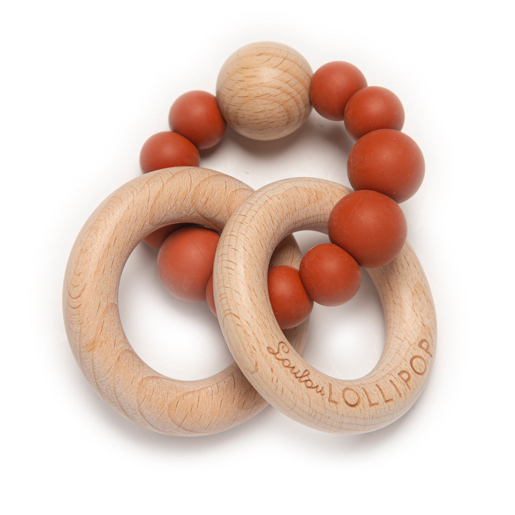 Safe and practical handmade teether with silicone beads and beech wood. Made in Canada