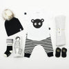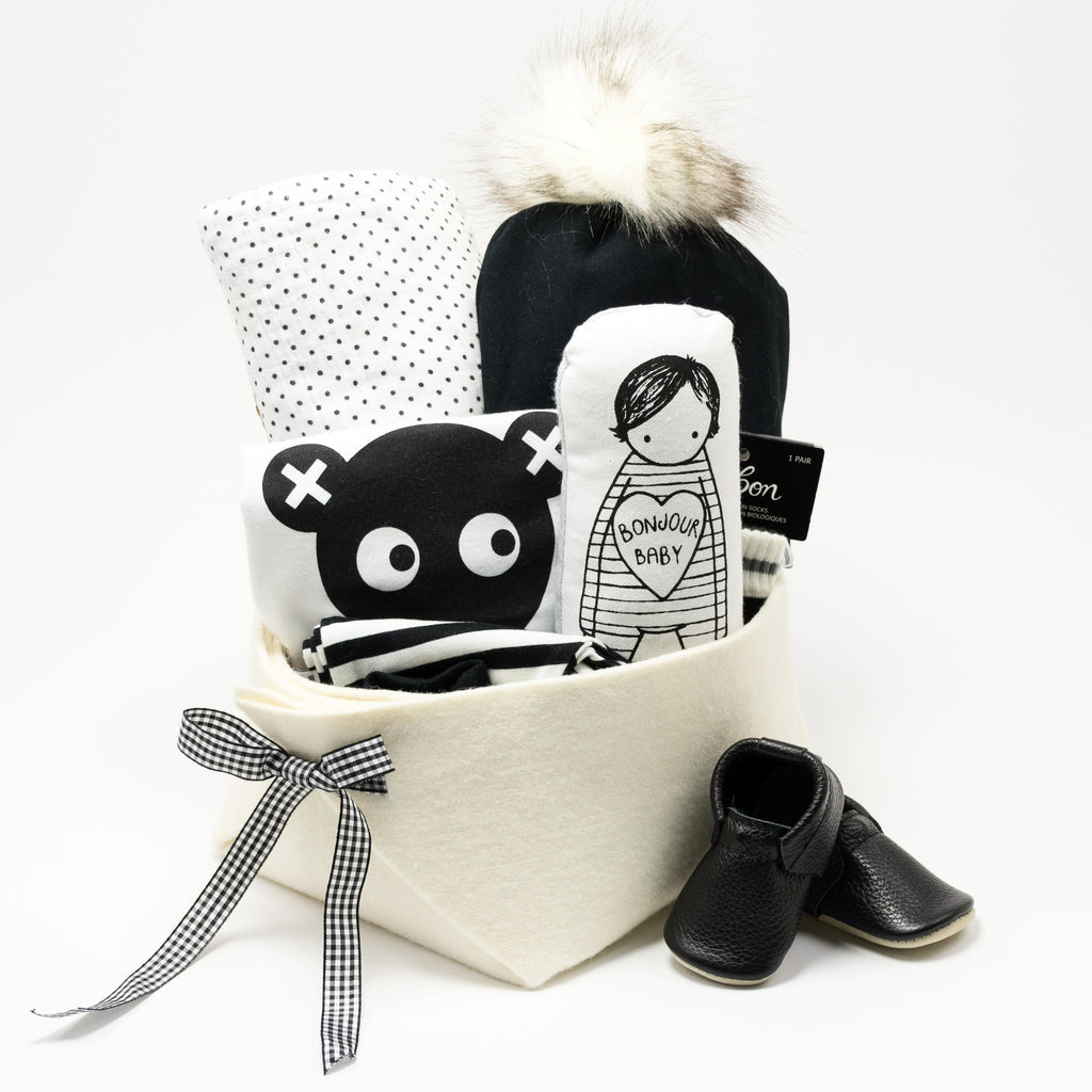 Trendy neutral Baby Gift Basket featuring My Mila striped harem pants and trendy beanie with faux fur pompom, a super adorable tee by Huxbaby and soft leather shoes by Minimoc, this babe is going to be the coolest in town. Complementing this sweet gift basket we’ve added an soft swaddle blanket, cable socks and a stuffy dolly by StudioNL. These hand-selected items are delivered in our signature wool blend felt storage basket, perfect for any nursery.