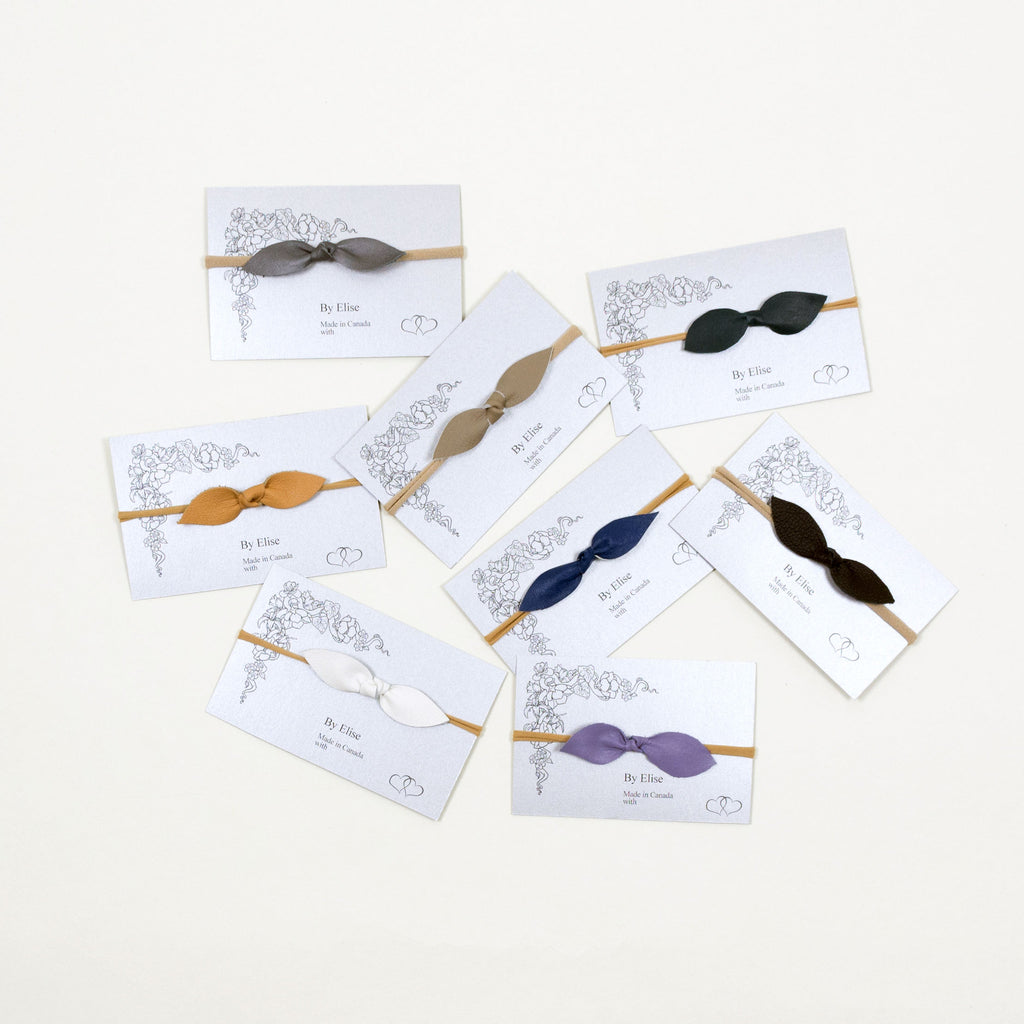 Adorable leather headbands in various colours. The bow measures 8.5 cm x 2 cm and is safely attached to the softest super stretchy band that will fit your baby from newborn to toddler and beyond. Made in Canada