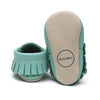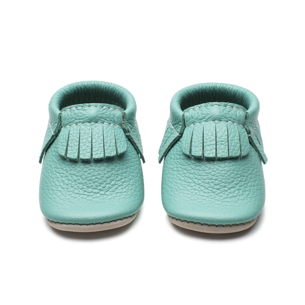 Minimoc Moccasins have been designed with an elastic at the opening that allows for an easy, slip-on fit, yet keep the shoes on the feet of even the most enthusiastic 'kicker'. The soft-soled bottoms of the shoes are suede which makes for great non-slip, indoor (and dry-weather outdoor) foot ware.