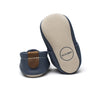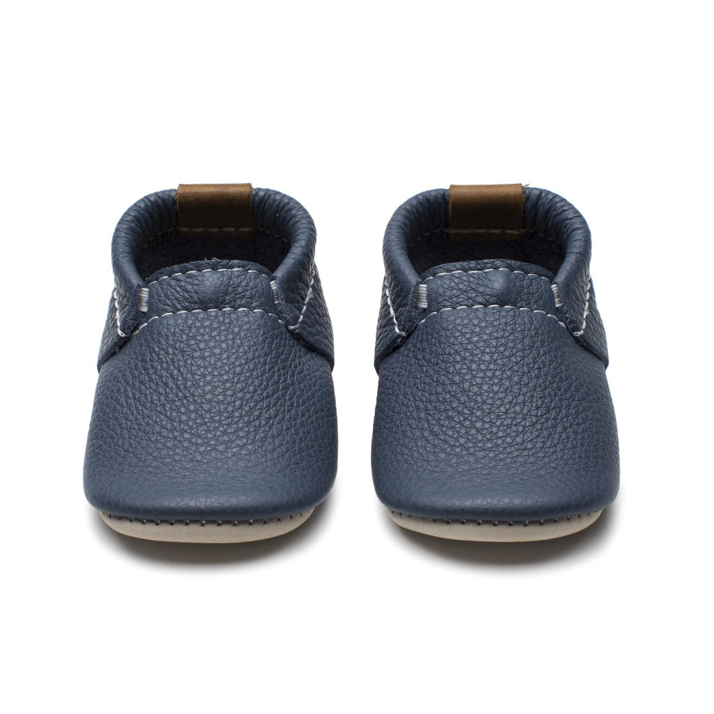 Minimoc Moccasins have been designed with an elastic at the opening that allows for an easy, slip-on fit, yet keep the shoes on the feet of even the most enthusiastic 'kicker'. The soft-soled bottoms of the shoes are suede which makes for great non-slip, indoor (and dry-weather outdoor) foot ware.