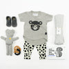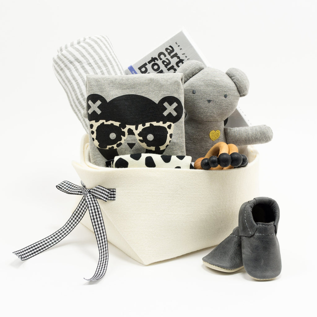 • For the mini trendsetters!! This super cool baby gift basket features adorable Huxbaby asymmetric tee and leopard leggings, soft leather shoes by Minimoc and a cozy swaddle blanket in grey stripes. We've added a safe wood and food grade silicone teether made in Canada,  art cards for baby's visual stimulation and an adorable soft bear with a golden heart by Huxbaby.  These hand-selected items are delivered in our signature wool blend felt storage basket, perfect for any nursery.