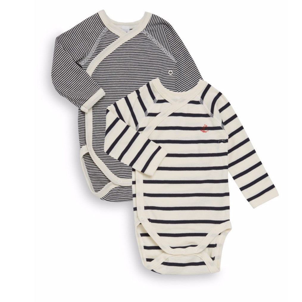 The cutest cotton kimono onesies set in Petit Bateau's iconic blue stripe. Soft and cozy for your babes. Perfect for a babyshower gift.