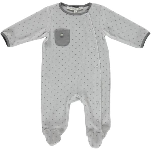 Super soft footie sleeper in velour featuring a faux pocket and a gorgeous print of stars all over by Purete du Bebe. Great addition to your BYOB (Build Your Own Basket). Fastens in the front with snaps