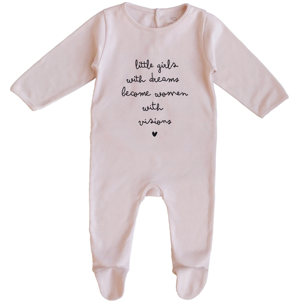 This luxurious soft pink baby girl sleeperĀ with adorable "little girls with dreams become women with visions" print is made withĀ a 100% GOTS certified organic cotton and closing in the back for easy changing. Ā Made inĀ PortugalĀ Ā