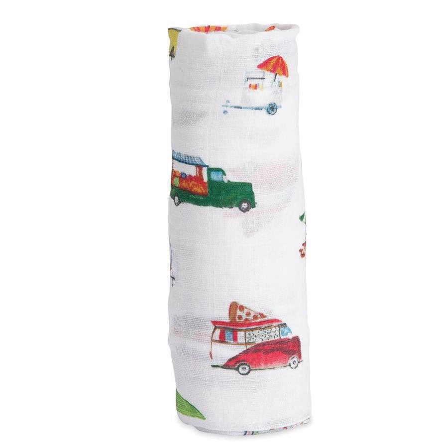 Wrap your little one up tight with this super adorable muslin swaddle blanket! Featuring a fun "Food Truck" print, it's the perfect way to keep your bundle of joy comfy and cozy. The lightweight cotton makes for easy snuggles--and the style is too cute! Generous 47" x 47" swaddle blanket in 100% cotton muslin, breathable and softer with each wash.